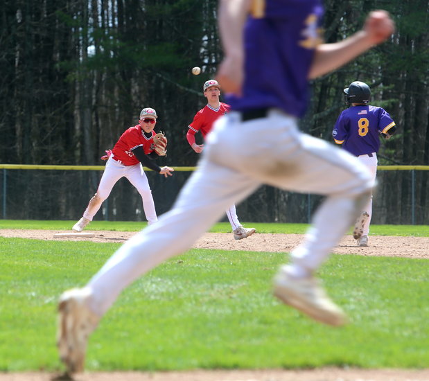 Looking for two: Guilderland’s Jake Pensabene looks to make a throw towards first base after stepping on second when receiving the ball from his teammate Nick Scott.