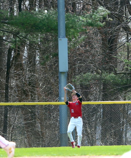 Sailing over: Guilderland’s Ryan Conklin sprints towards the foul line as he races over to make the catch.
