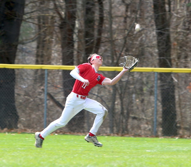 Easy wait: Guilderland’s James Buccini camps under the fly ball as he holds up his glove to wait for it to come down.