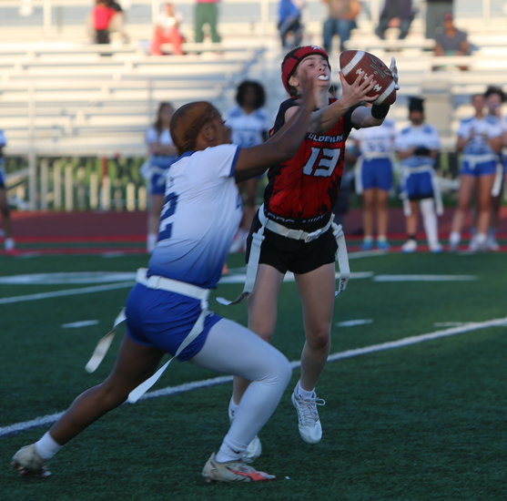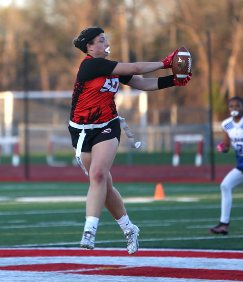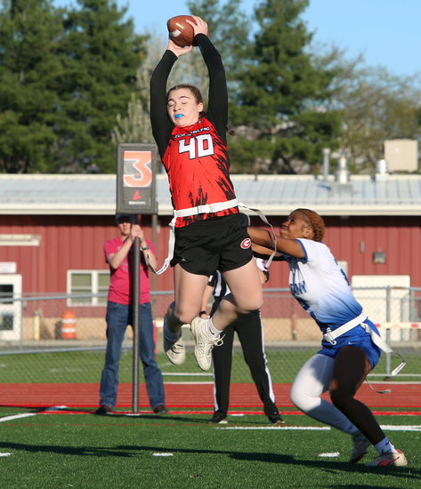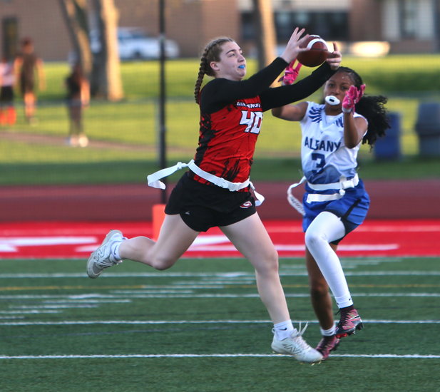 Going up high: Guilderland’s Peyton Dominy leaps up as high as she can go grab the high pass and get up field before the Albany player pulls her flag.