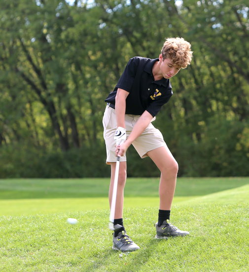 Head down: Blackbirds’ Andreas Amedore looks at the ground as he makes contact with his ball for a chip shot towards the green. Amedore shot a 91.