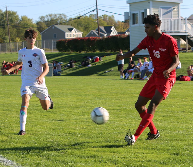 Sneaking it through: Dutch’s Langston Threatte makes a pass with his left foot across the box to an open teammate to put it in. Threatte had an assist.