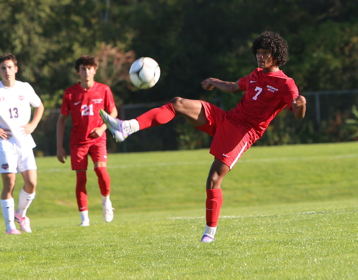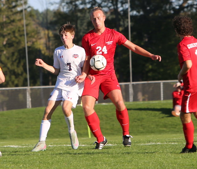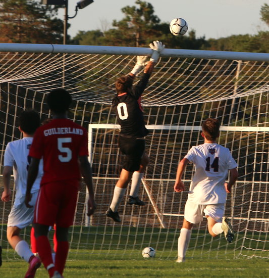 Keeping it away: Dutch’s Colin Chapman leaps up to get his glove on the cross to keep it from getting near any Patriots’ player late in the second half.