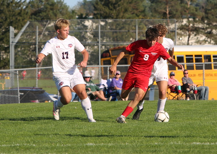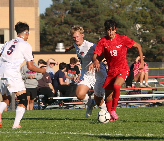 Taking on two: Dutch’s Selmir Jusic attempts to dribble to his left as Patriots’ Alex Borden (5) and Landon Crane (17) try to stop Jusic from getting into the penalty box.