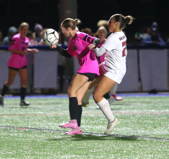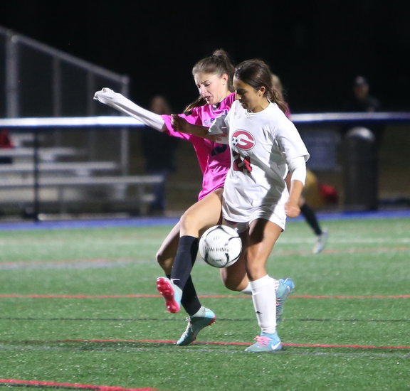 Blocked off: Guilderland’s Stella Cavillones gets shielded off the bouncing ball inside the penalty box during the first half.