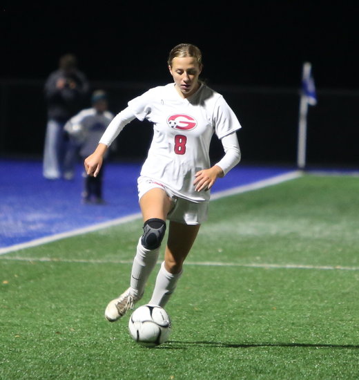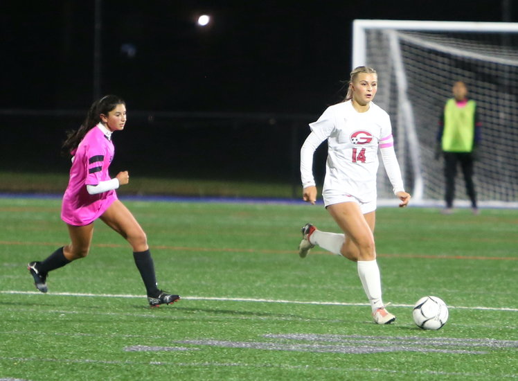 Skirting up the line: Guilderland’s Ashley Kapusinsky gets into the open field as she dribbles up the sideline.