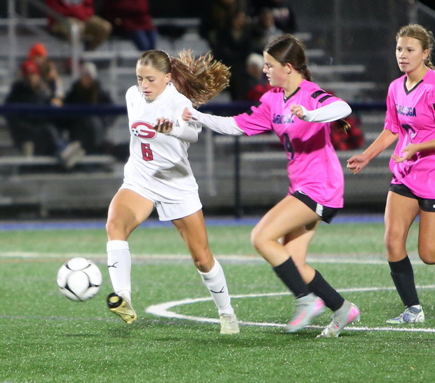 Little tap: Guilderland’s Eryn Tynan knocks down the bouncing ball with her right foot as she feels the pressure from Saratoga’s Ashley Shaw on her left side.