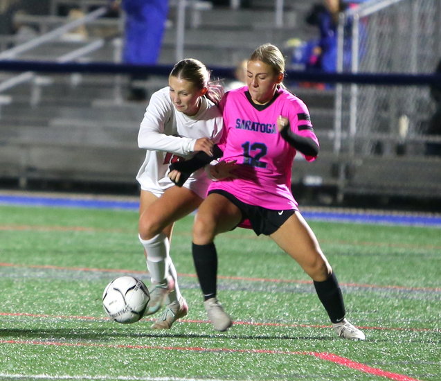 Shoving: Guilderland’s Lauren Hickey and Saratoga’s Emma Poirier lean into each other as they both compete for the loose ball on Saratoga’s side of the field.