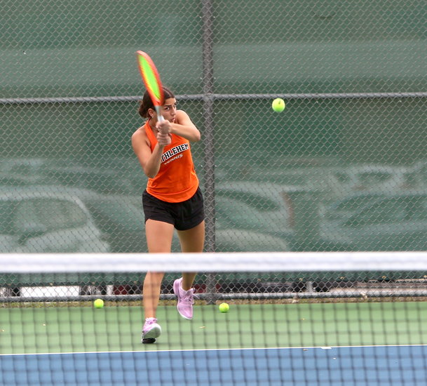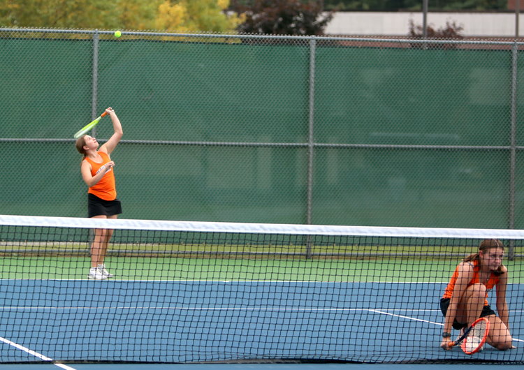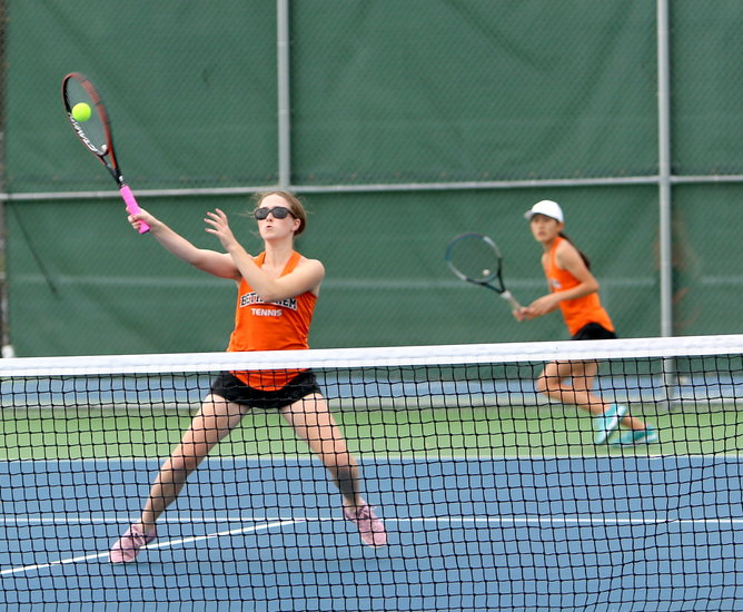 Standing ready: Eagles’ Macy Young hits a forehand as teammate Laila Basson awaits any shot back from Shen’s Alexa Kloposky/Callie Hanley. Young/Basson fell 5-7, 2-6.