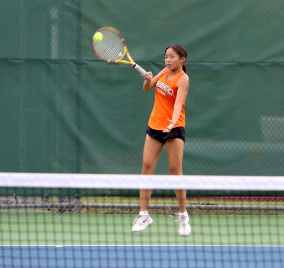 Going low: Eagles’ Sahasra Hongalgi puts her racket near the ground to get a forehand shot back towards Shen’s Yuni Kwon. Hongalgi fell 4-6, 4-6.