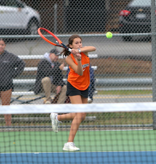 Hitting the line: Eagles’ Emilia Palella stares at the ball as she hits a laser backhand back to Shen’s Val Povysheva. Palella fell 1-6, 4-6.