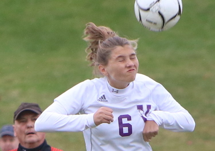 Eyes closed: Voorheesville's Abby Sidoti jumps high to get her head on the ball during the first half.