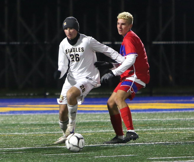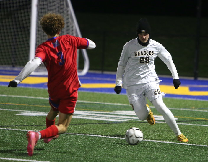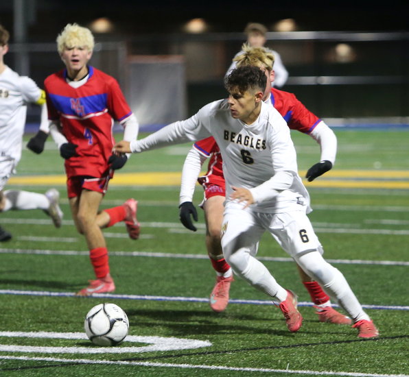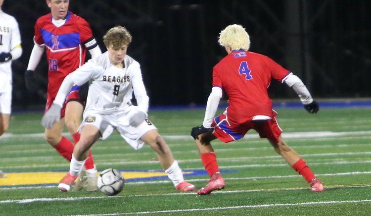 Being shifty: Beagles’ Aggelos Lefkaditis looks to make moves on the Maple Hill defense as he attempts to get to goal.