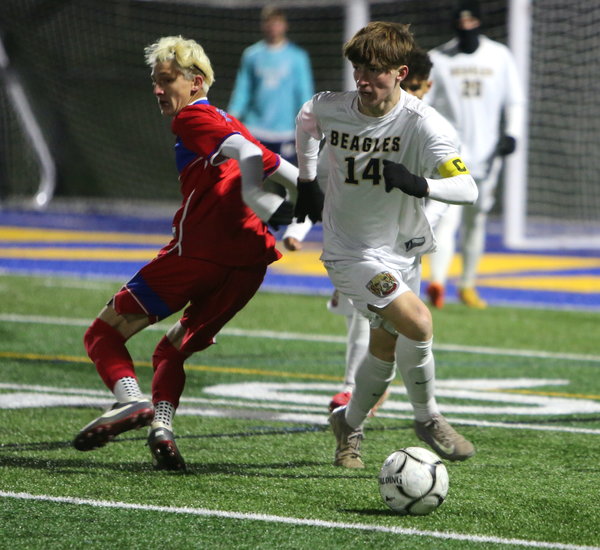 Full speed ahead: Beagles’ Jack Jewett dribbles the ball up quickly towards goal as the Maple Hill defender runs beside him.