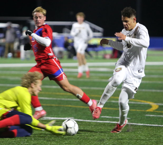 Quick push: Beagles’ Aggelos Lefkaditis looks to put his right foot onto the loose ball before the Maple Hill goalie gets his hands on it.
