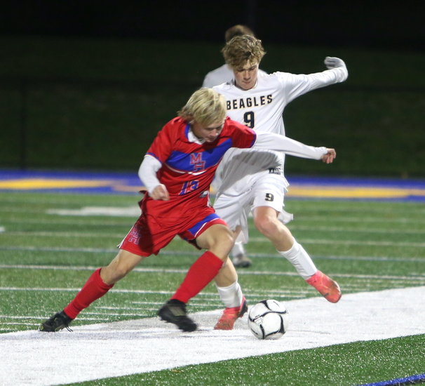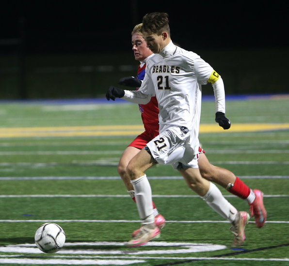 Slapping it ahead: Beagles’ Nolan O’Connor looks to get his right foot onto the loose ball as the Maple Hill player tries to lean into him.