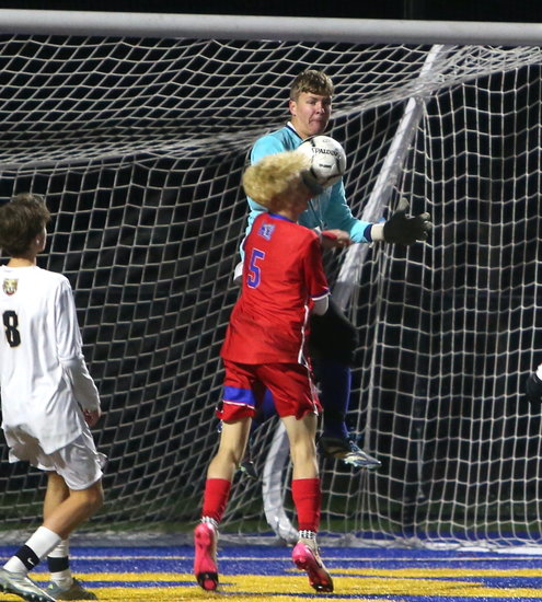 Fighting off: Beagles’ Andrew Zink leaps up for the high shot to make the save just as the Maple Hill player uses his head to redirect it.