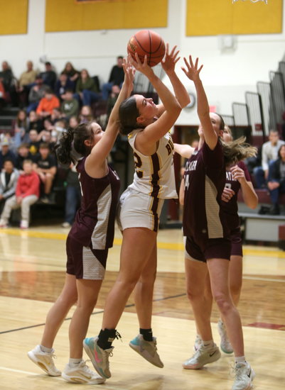 Quick put back: Bulldogs’ Charlotte Elble goes up strong to take a shot after collecting a rebound. Elble had one rebound.