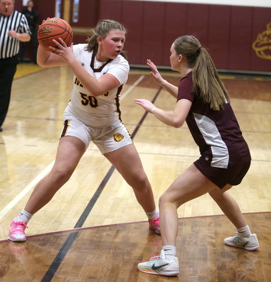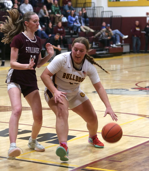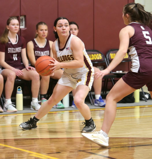 Eyeing an opening: Bulldogs’ Carson Daguillo holds onto the ball as she looks to make a move on Stillwater’s Leiann Thompson. Daguillo had four points and five rebounds.