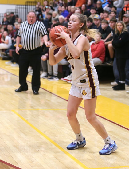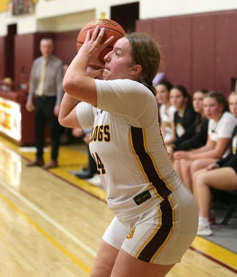 Open look: Bulldogs’ Molly Shaver spots up for a three-point shot during the second quarter as the Stillwater coach looks on. Shaver had 11 points and three rebounds.