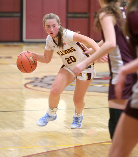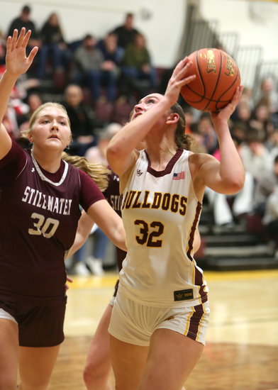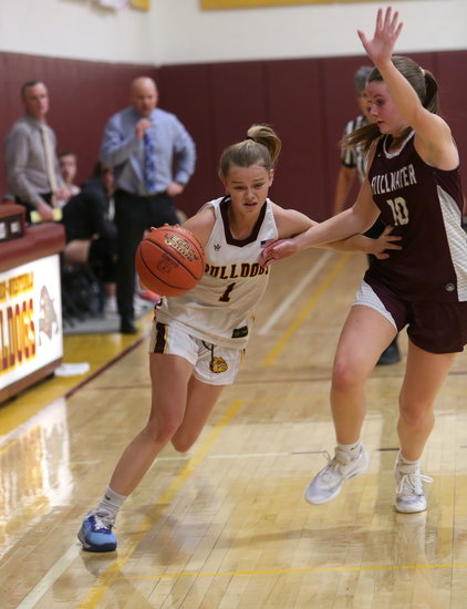 Dribbling hard: Bulldogs’ Molly Shaver uses her left arm to fend off the oncoming Stillwater defender in the second quarter. Shaver led the Bulldogs with 11 points and three rebounds.