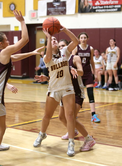 Strong move: Bulldogs’ Annie Lendrum drives towards the hoop as Stillwater’s Andie Luskin defends. Lendrum had seven points and eight rebounds.