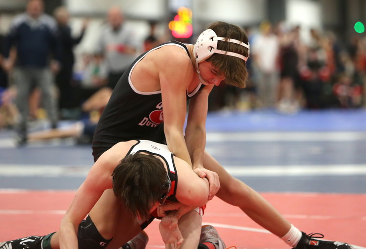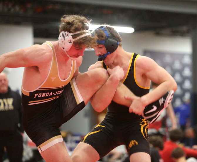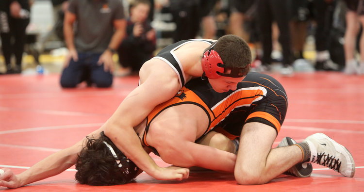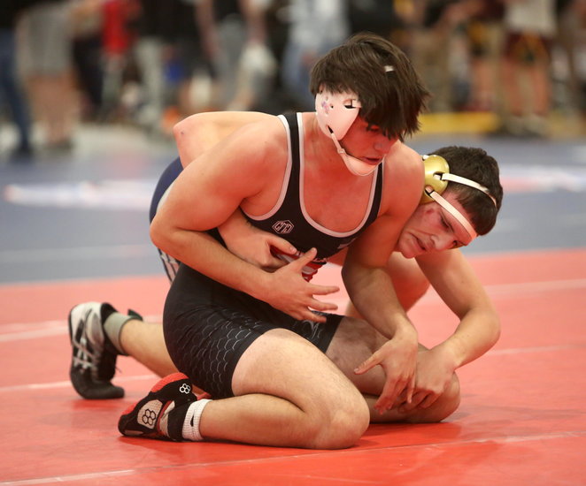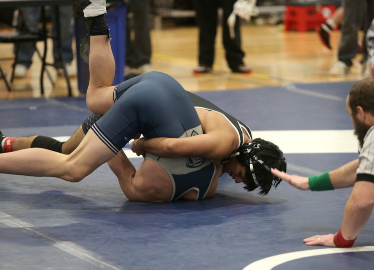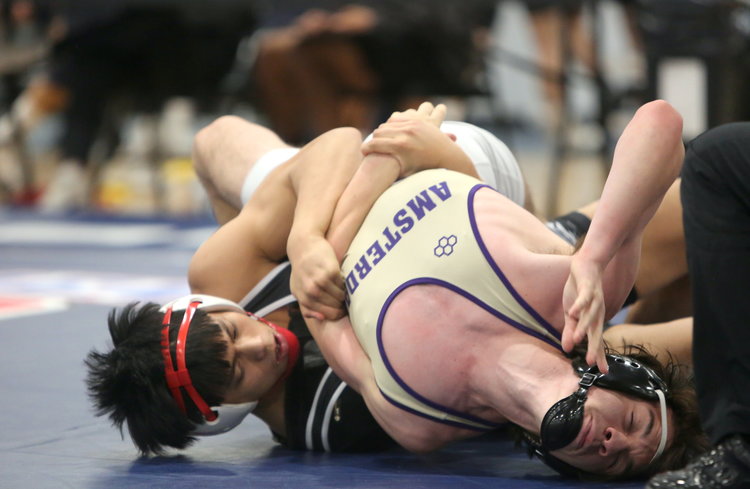 Gotcha! Guilderland’s Danyal Afridi wraps his arms around the midsection of Cobleskill-Richmondville’s Victor Gonzalez to put his shoulders on the mat as the ref's hand comes down in their 165-pound match in the orange division. Afridi won by pin in 59 seconds and finished third.