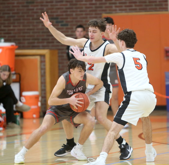 Swarmed: Eagles’ Aidan Childs (5) and John Heffern (12) double team Fox Lane’s Will Broghammer in hopes to force a turnover.