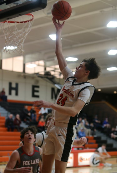 Cutting in front: Eagles’ Nicholas Robbins goes up for a layup after grabbing a rebound in front of Fox Lane’s Janak Bain in the third quarter. Robbins had four points.