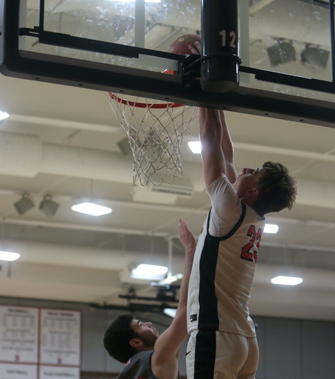 Clean air: Eagles’ Connor Yohe flies into the air as he leans in to attempt a layup in the fourth quarter.