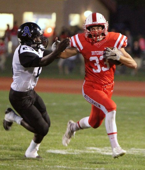 Returning to form after a year of struggle, the Guilderland football team, throughout the season, turned the tide with a powerful run attack, like that shown by Cameron Long as he muscles off an Albany High player. In the end, the Dutch lost in the sectional semifinal to Shaker.