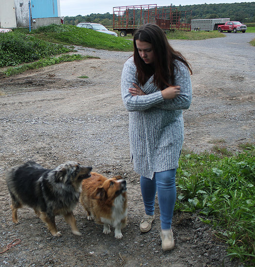 Cheyenne Keppler stands with her two dogs, Moose and Jackson, at her family’s farm in Knox on Monday. Behind her, the last of the Keppler cattle are being loaded into another farm’s truck.