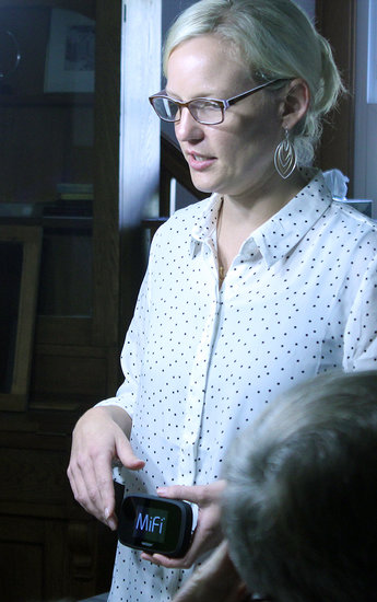 Dr. Kristin Mack shows a group of emergency medical technicians how to operate a “MiFi” device in their training to become “vitalists” who visit patients and take vital signs while a doctor speaks with the patient over a video feed. The “MiFi” ensures vitalists always have internet access.